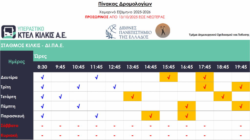 - Ισχύει από Δευτέρα 13/10/2025 έως νεωτέρας ανακοίνωσης δρομολογίων μέσα στον μήνα.