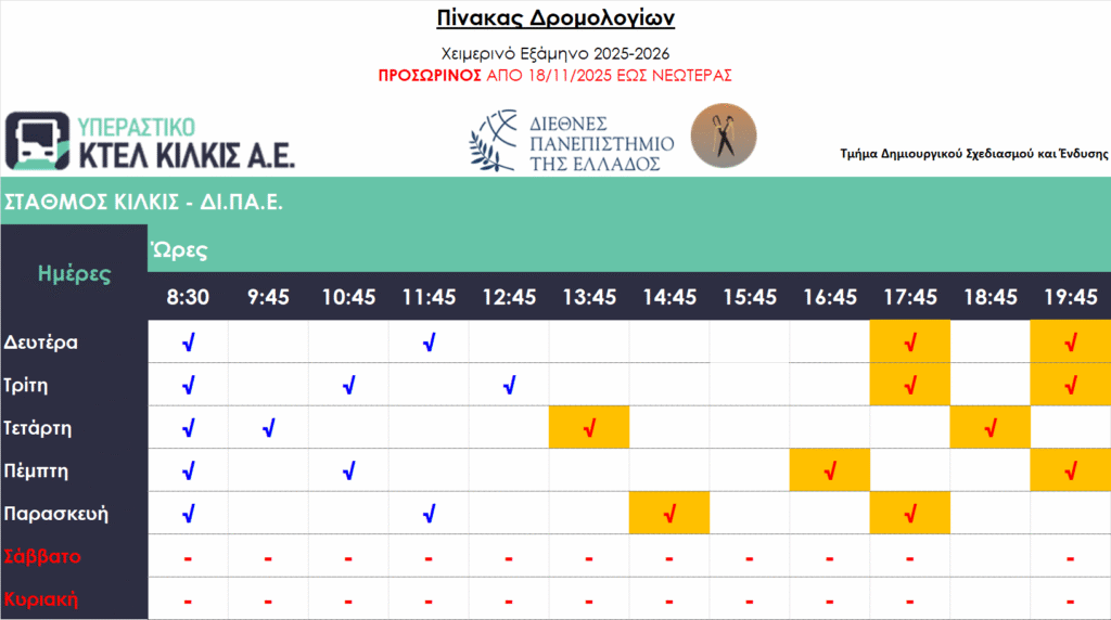 • Ισχύει από Δευτέρα 18/11/2025 έως νεωτέρας ανακοίνωσης δρομολογίων μέσα στον μήνα.